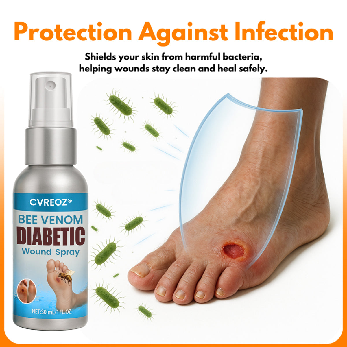 Even minor wounds can become serious if infected. With natural antibacterial properties, CVREOZ® Bee Venom Diabetic Wound  Spray shields your skin from harmful bacteria, helping wounds stay clean and heal safely.