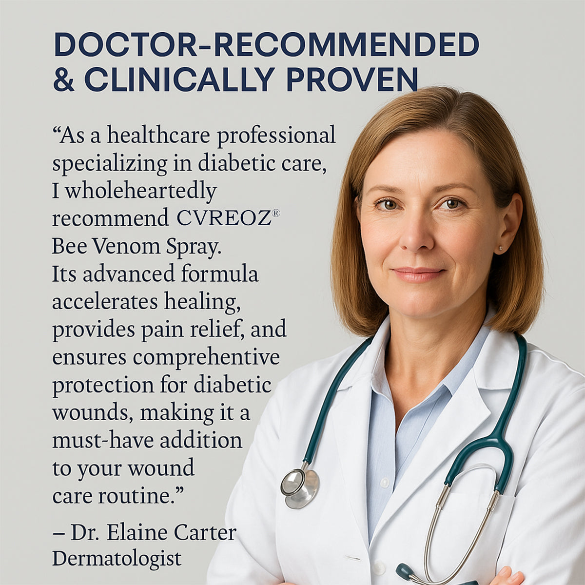 “As a healthcare professional specializing in diabetic care, I wholeheartedly recommend CVREOZ® VenHeal Bee Venom Spray. Its advanced formula accelerates healing, provides pain relief, and ensures comprehensive protection for diabetic wounds, making it a must-have addition to your wound care routine.”