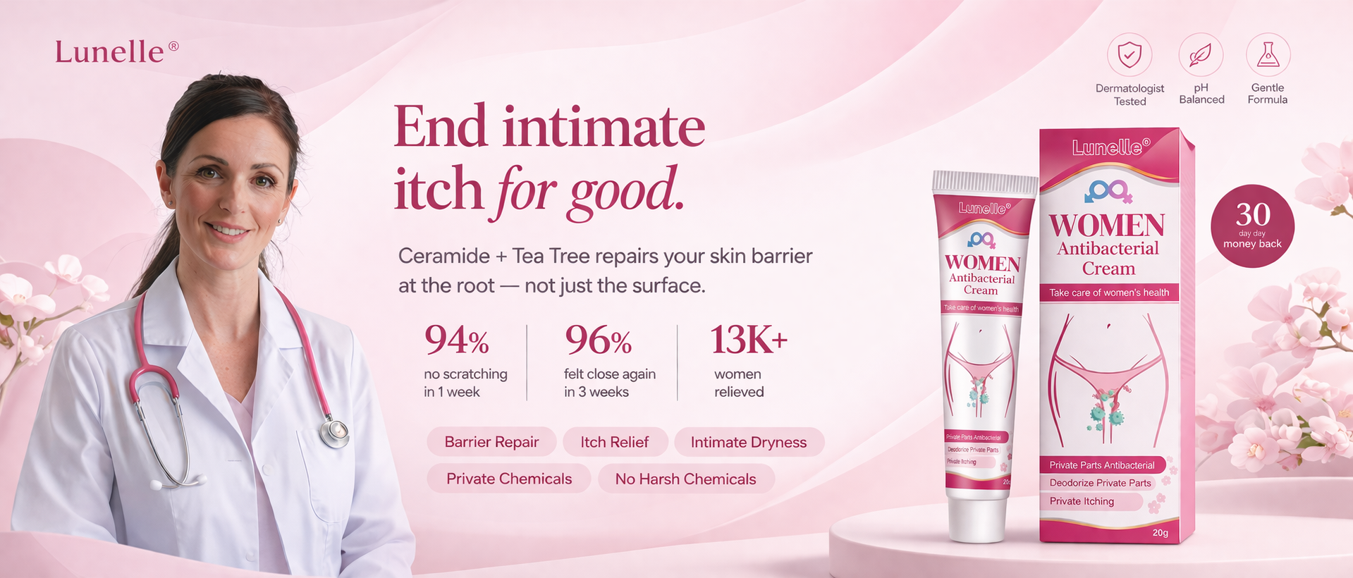 Lunelle® is the first intimate cream formulated around barrier repair, not just symptom suppression. When your skin barrier is intact, itch has nowhere to come back to.