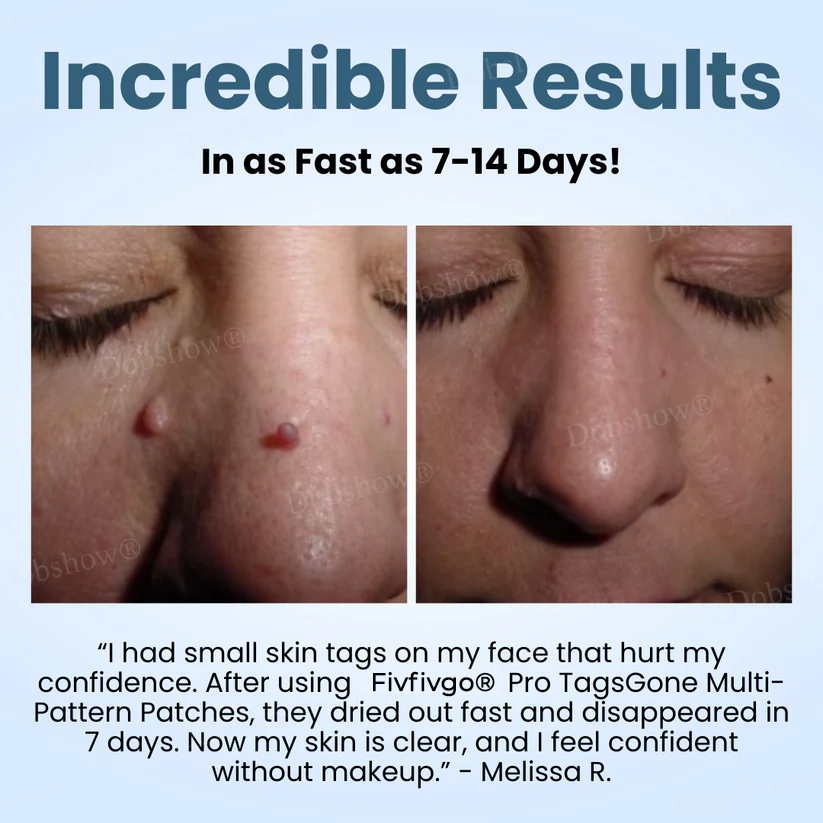 That’s where Fivfivgo® Pro TagsGone Multi-Pattern Patches come in! These patches are designed to quickly and safely remove warts, moles, and skin tags. They use advanced technology to target these skin growths, promoting their gradual elimination without pain, scarring, or expensive treatments. With regular use, you can see visible results in as little as two weeks. Simply apply the patch to the affected area, and let it work its magic—no need for invasive procedures. Whether you're dealing with stubborn warts, unwanted moles, or irritating skin tags, Fivfivgo® Pro TagsGone Multi-Pattern Patches offer a convenient, at-home solution to achieve smooth, clear skin.